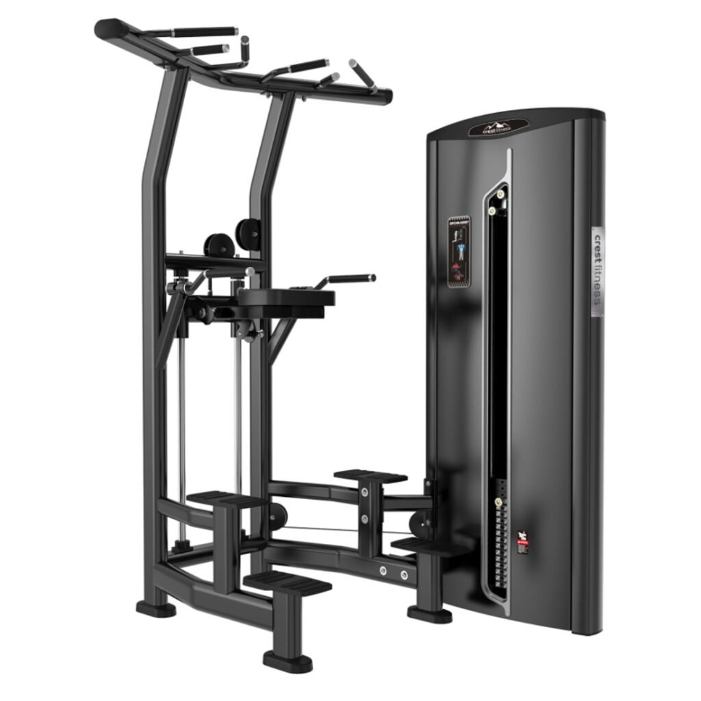 Crest Iconic series weight-assisted chin dip machine features a sturdy design with a 96+4.6kg weight stack for controlled resistance. Built with precision for upper body workouts, it supports effective chin-up and dip training. Its strong frame ensures durability and stability, while the ergonomic design allows smooth and comfortable motion during exercise.