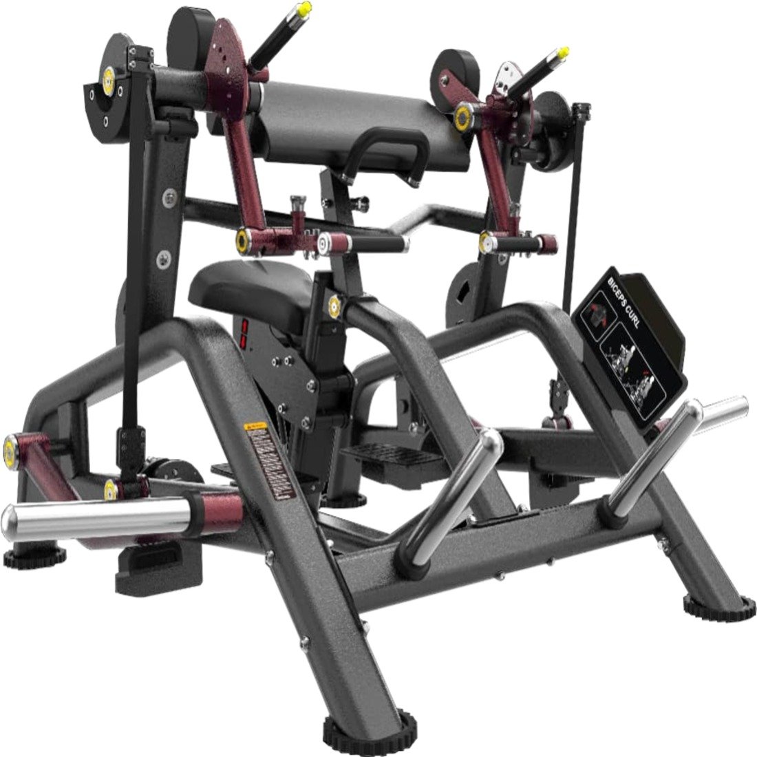 Plate-loaded strength training machine, which means weight plates are manually added to the loading pegs for resistance.